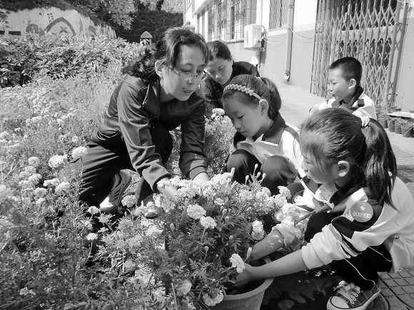 连日来,威海市南山小学20名师生将自己在种植园培育的金钟菊移栽到花盆中,扮靓校园。为加强小学生们的动手能力和科学实践能力,南山小学专门开辟了一块空地,作为科学种植园。在老师的指导下,同学们种植了菊花、花生和地瓜等植物,体验亲自耕耘和收获的快乐。本报记者 刘洁 通讯员 薛红伟 摄