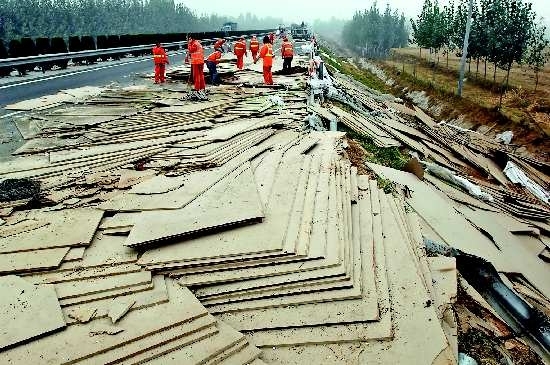 19日凌晨,—辆拉着密度板的半挂车行驶到济广高速74.9公里处时,为了避让超车的小轿车,司机猛打方向,半挂车发生侧翻冲下高速,轿车前部损坏,半挂车上三人—死两伤。记者看到,事发现场的路面和旁边壕沟里散落着近30吨密度板。 本报记者 王媛 摄