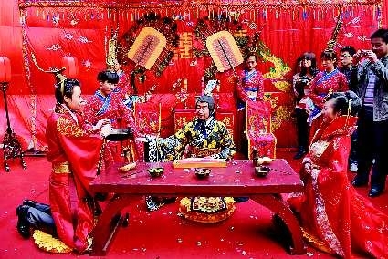 10月17日,在滕州问天广场内,随着赞礼(现称司仪)的—段文言文开场白,新郎段磊和新娘李泉泉的汉式婚礼拉开帷幕。