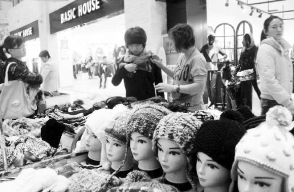 19日,在泰华新天地一楼大厅内,不少商家将棉帽、围巾、棉拖等御寒品摆在了商场显眼的位置。据了解,气温骤降,市场上的保暖品迅速畅销,预计今年的销售旺季比往年来得要早。