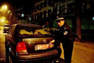 就在两车交会而过的瞬间,驾车民警习惯性地望了一眼后视镜,却看到该车后牌照用一块红色物体遮挡得严严实实。“深夜为何还故意遮挡车牌?”警觉的民警判断这辆“宝来”车非常可疑,于是立刻掉转车头跟了上去。