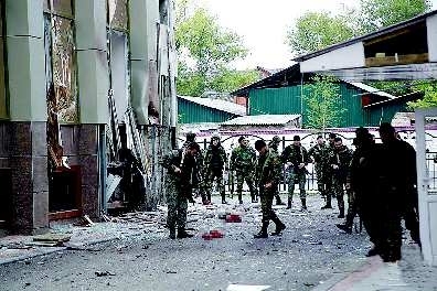 内务部下属特种部队身着迷彩服,手持装有榴弹发射器的卡拉什尼科夫冲锋枪,在事发区域巡逻。