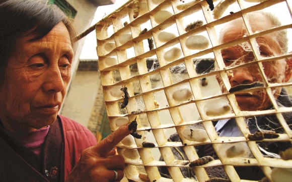 本应挂满白白胖胖蚕茧的茧簇,却出现不少死去的黑蚕。19日,岱岳区马庄镇泉头村66岁的养蚕村民刘翠云(左)和72岁的老伴孔繁珊看着茧簇伤心不已。与他们一样,该村近百户村民养的蚕都出现了类似情况。