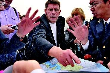 18日,俄罗斯运输部海河运输署等部门—行9人来到济宁郭庄港区和跃进港区。图为俄罗斯专家从地图上了解济宁内河航运的发展情况。
