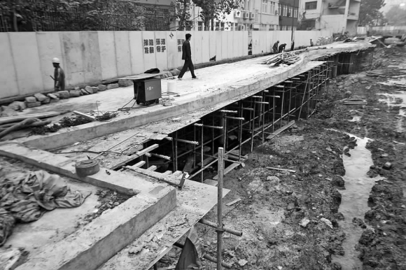 19日,记者在四方杭州路河整治现场见到,河道上已经浇筑上混凝土加固,上面则形成了一条人形道。据介绍,杭州路河自今年7月份开始整治,截至目前,河道上的建筑物都已拆除完毕,之后工人将开始河道的淤泥。明年4月份杭州路河整治将完工,建成后不仅成为一处公共休闲广场,而且还将有效缓解汛期时的泄洪能力。 本报记者 杨宁 摄影报道