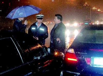10月18日,在东城府前大街与胶州路路口处,两辆车争抢车道顶了牛。事故处理民警提醒市民:雨天路滑,视线也受影响,驾车要加倍小心。