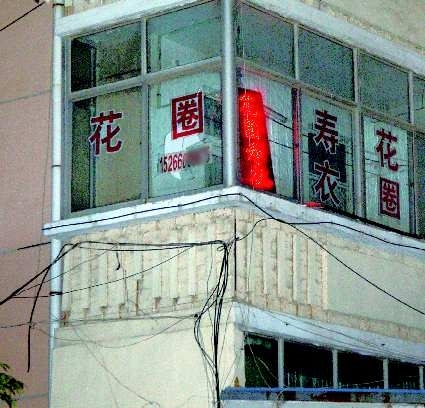 21日9时,记者再次来到府前小区。记者看到,花圈店非但没有把店迁走的意思,反而在阳台上安装了闪烁的霓虹灯。小区一位居民称,20日早上花圈店还没安装霓虹灯,他中午回来时发现竟然安上了霓虹灯。阳台玻璃被人砸坏,晚上霓虹灯开着,“花圈寿衣”四个红字闪闪发光。住在楼上的刘女士说:“今早,我出来买早饭时看见一闪一闪的‘花圈寿衣’4个字,感到毛骨悚然,居民楼咋能弄这些东西呢!”这栋楼住的多为老年人,他们看见这些字眼心里会很不舒服。