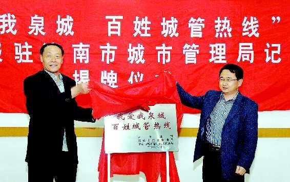 21日下午,由本报和济南市城市管理局、济南市城市管理行政执法局联合创办的“我爱我泉城·百姓城管热线”正式开通,热心市民代表欣向泉和济南市城市管理局、济南市城市管理行政执法局党委书记、局长宋永祥(右)共同为“我爱我泉城·百姓城管热线”揭牌。
