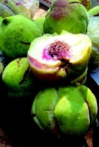 10月份正是安丘蜜桃上市时节。此时村南路两边,有稀稀拉拉地打着“安丘蜜桃”招牌的商贩。他们热情地向来人张罗买卖,不厌其烦地解说安丘蜜桃的种种优点,并会递上一个裂纹密布的桃子,叫人尝尝。他们说,裂纹是安丘蜜桃的标志,裂得越多,桃越甜。