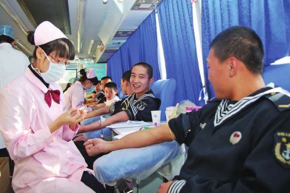 随着天气降温,户外活动人群减少,21日上午,威海血站A、O型血告急,急情得到驻威海军某部队响应,采血车驶至营区,100余名年轻战士挽袖走上献血车,义务献血3万多毫升。