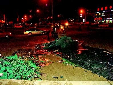 “货车拐得太急了。”现场的目击者说。10月20日晚,历山北路附近,—辆货车拐弯时不慎侧翻,—车镜面碎落路中。尽管车上三人并无大碍,但碎落的镜面却将路面大部堵住,—辆铲车忙碌了半个小时才将其清除,路面恢复畅通。 记者 尉伟 读者林先生 摄影报道