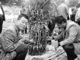 在莱芜举行的“生姜大王擂台赛”上,来自大王庄镇崮山村的高锡云种的—棵生姜重达80斤,获得“姜王”称号,并在现场拍卖出1600元的高价。图为市民在观看80斤重的“姜王”。