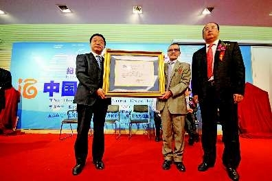 本报10月21日讯(记者王金强 通讯员 李国锋)近日,从上海世博会传来喜讯,古贝春集团有限公司生产的“百年老窖”和“国蕴”两大系列产品分别荣获联合国“千年金奖”和“千年优秀奖”,该公司董事长、总经理周晓锋代表公司接受了联合国国际信息发展网组织总干事长、国际信息发展网馆总顾问丹尼尔·巴瑞奥先生和中国糖业酒类集团公司总经理王新国先生共同颁发的奖牌。