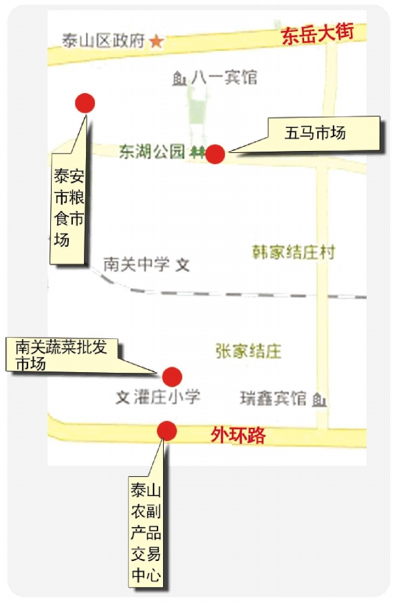 “泰城目前有三家比较大的市场,南关蔬菜批发市场和粮食市场都属于专业性市场,五马市场是以经营鲜活农产品为主的综合性市场,这三家市场原本相距较远,彼此经营的内容又不互相较叉,所以之前一直很平静,但位于泮河大街中段的泰山农副产品交易中心一落地,便与这三个市场形成竞争,带来很大的影响。”五马市场干货商龚先生说。