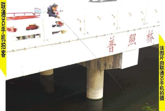 21日,一钓鱼爱好者坐着三轮车上,趴在擂鼓石大街的普照桥栏杆上钓鱼,存在一定的安全隐患。