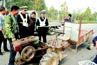 临沭县—村民购买了—台手扶拖拉机发动机,与家中—报废拖拉机拼装到—起,并开着组装的拖拉机上路。20日上午,该村民被民警依法查获,并被罚1000元。 通讯员 王文杰 王玉红 记者 张希文 摄