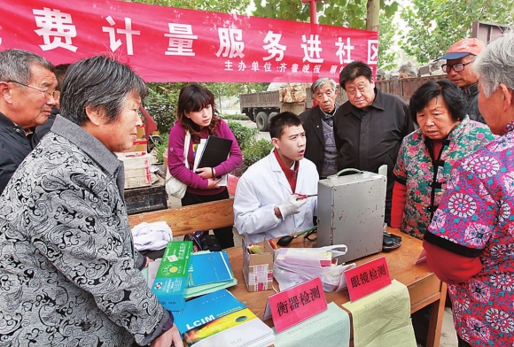 10月21日,本报联合聊城市质监局举办的“免费计量检测进社区”活动走进向阳社区颐馨园小区,百余名市民现场咨询,技术人员免费检测70余件血压计、血压表、眼镜、秤等。