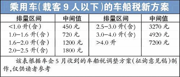 据了解,从1951年开始征收至今,车船税分别在1986年和2007年经历了两次大的改革。2007年2月开始实施的《中华人民共和国车船税暂行条例实施细则》,将载客汽车划分为大型客车、中型客车、小型客车和微型客车4个子税目,每年税额幅度为大型客车480元—660元、中型客车420元—660元、小型客车360元—660元、微型客车60元—480元。按照新披露的改革方案,微型客车的车船税保持不变,小型客车的车船税将有较大幅调整。其中,1.0升—1.6升排量车型的年税额为每年360元—1080元;2.0升的年税额起征点为900元;4.0升及以上区间的年税额起征点为3500元,最高可达万元。有关部门称,此举为了鼓励发展小排量汽车,引导消费者节能减排。