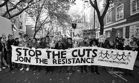当地时间2010年10月20日,英国伦敦,民众举着抗议标语向唐宁街游行,反对政府推出削减开支方案o据了解,英国政府20日公布削减开支计划,将减少约两成开支,包括裁撤工作岗位、大幅削减各种福利支出等o到2020年,英国人领取政府养老金年龄将提高至66周岁o