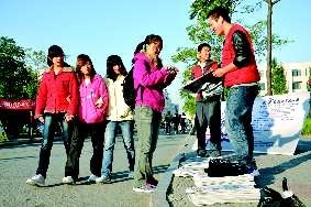 “我想参加到这个活动怎么报名啊?”正忙着卖报,一名衣着朴素的女生抓住杜晓斌问。杜晓斌干脆一边卖报一边和她交谈,告诉她参加这个活动的方法。这名女生告诉记者,“我想参加这个活动锻炼一下,也赚点生活费给家里减轻点负担。”她还告诉记者,自己是人文学院的学生,来自西部山区。