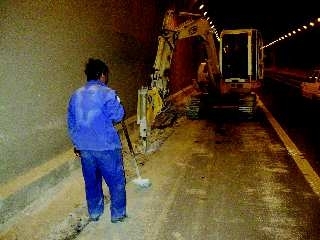除了工人正在忙碌以外,一辆大型的挖掘机也开进了隧道,伴随着一阵阵刺耳的声音,隧道两侧靠墙的路面都被挖掘机锋利的钻头掘开。“挖掘机开凿的是导水槽,从墙壁的引流管里引出的渗水将流入路面的导水槽内排出隧道,这样的话就能防止路面湿滑,保持隧道内的干燥。”施工人员说。