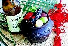 四喜养生海参,(自制东坡肉搭配豆腐、猪血、菜心、木耳等作为海参配菜,用紫砂容器上桌,分量足,有特色。)温拌鲍鱼片配瑶柱丝、上汤鲜虾捞面。