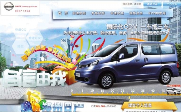 随着金九银十汽车销售旺季的到来,各大汽车厂商纷纷出招忙促销。自2008年郑州日产推出的基于“穿越东方”马拉松越野拉力赛赛事活动的“穿越东方在线游戏”深受好评,并获得“Adworld互动营销大奖TOP102008年度互动营销十佳案例”后,郑州日产于今年10月11日-11月30日再次推出了“自信由我-赢郑州日产NV200”在线营销活动,通过“重量级”的优惠,结合线上活动与线下促销举措回馈消费者。