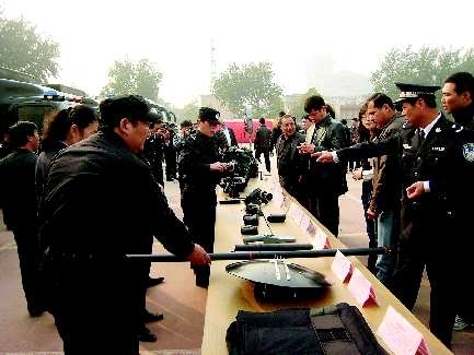 22日,山东警察培训学院的操场上整齐地排列着装甲防暴车、反恐突击车和布障车。车辆前方的桌子上摆放着各种先进的武器装备。当日,在该学院参加培训的乌兹别克斯坦反恐研修班,与济南市特警支队就反恐协作进行研讨交流。 本报记者杜洪雷摄