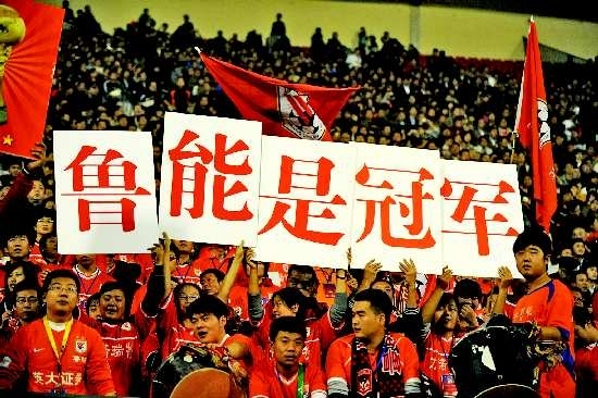 比赛开始的哨响后,能容纳6万人的体育场涌进了35000多名球迷。锣鼓喧天,加油声起,鲁能球迷一心等着自己心爱的球队,快刀斩乱麻地踩着兄弟的肩膀夺冠。“满贯才是硬道理”,给力的标语将鲁能的野心彰显无遗。