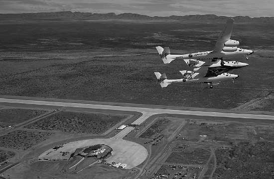 10月22日,在位于美国新墨西哥州拉斯克鲁塞斯附近沙漠地区的“美国太空港”,母船“白骑士二号”与太空船“VSSEnterPrise”在机场上空盘旋。