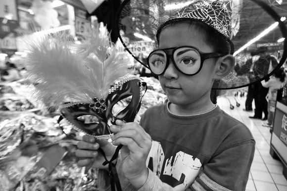 24日,宁夏路上的一家超市内设立了万圣节饰品专柜,不少孩子纷纷带上面具体验了一把。10月31日是西方传 统的万圣节,人们要戴上丑陋的面具驱赶恶灵,而且家里会用南瓜、蜘蛛等饰品来布置,是一个充满神秘而又欢乐的节日。 本报记者 杨宁 摄