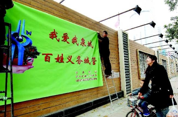 24日下午4时许,工作人员将写有“我爱我泉城·百姓义务城管”的宣传画贴在了泺源大街南侧的文化墙上,自此掀开了省城百余面文化墙全面整修的大幕。下一步,济南市还将统一规划,在全市大规模建设和更新一批文化墙。 本报记者 王媛 摄