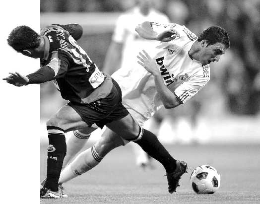 在西班牙足球甲级联赛第八轮比赛中,皇家马德里队主场以6比1战胜桑坦德竞技队。图为皇家马德里队球员伊瓜因(右)与桑坦德竞技队球员托雷洪拼抢。 新华/法新