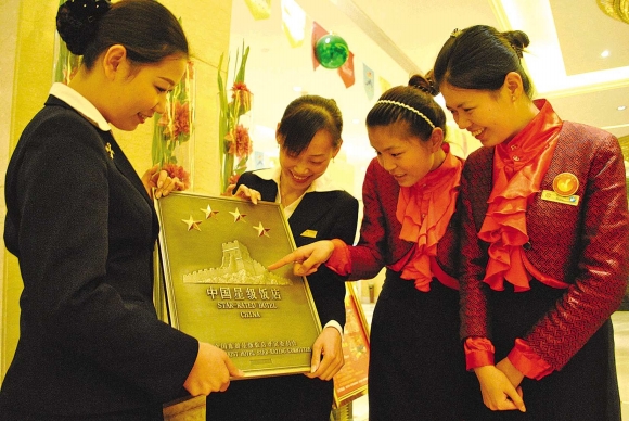 24日,丽景广场酒店前厅接待人员捧着刚刚获得的中国星级饭店标牌,高兴地看着标