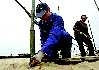 1O月24日,在烟台市第三海水浴场,工人正在搭建保护浴场沙滩的护栏。