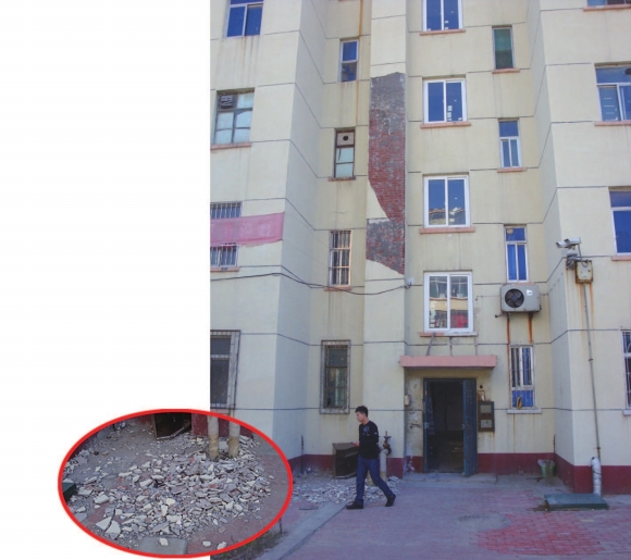 25日11时许,记者到17号居民楼北侧墙皮大面积脱落,地上散落了很多水泥块。楼体上还有一些墙皮已经开裂,随时有掉下来的可能。