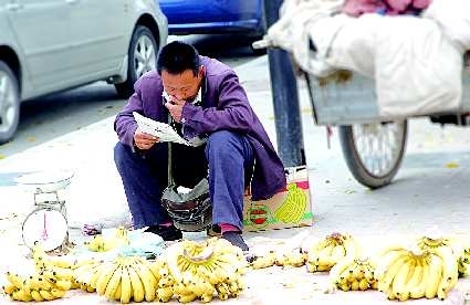 10月24日,济南路上一水果摊主在摊前看杂志打发时间。摊主告诉记者香蕉价格比去年涨了不少,价格高了,买的少了。