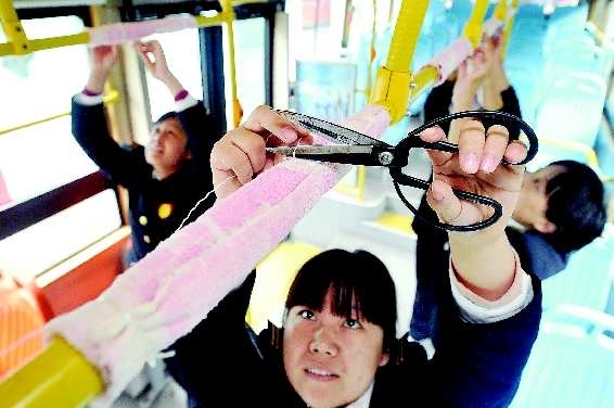 冷空气来临,为使乘客在车厢内感受到温暖,25日,济南138路公交车的司机们买来毛巾,剪成条状绑在冰冷的扶手上。
