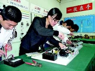 25日,记者来到济南物业管理职业学校,在电拖实训室,周琼正在和其他三位同学进行电路操作的实验。身穿黑色制服,戴着黑框眼镜,扎着高高的马尾辫,与其他同学相比,1988年出生的周琼显得较为成熟、稳重。