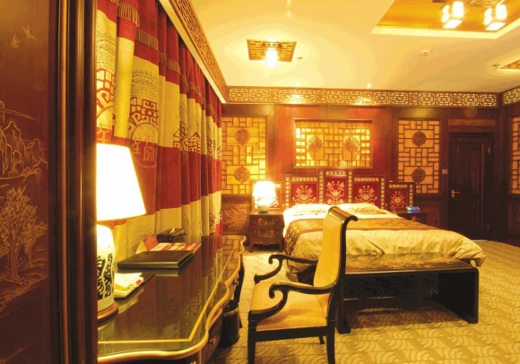 蓬莱作为闻名遐迩的旅游胜地,同时也是享誉海内外的休闲名城。一整天徜徉于仙境景色与传统文化,到了夜晚,必然不能错过的是按照五星级标准打造的中国古典宫廷式酒店———三仙山大酒店。酒店以古典建筑、古典装饰装修、古典名家具为主要风格。大堂天顶以故宫勤政殿为蓝本,采用24K纯金箔打造而成,房间、餐厅全部采用明清风格木雕装修,家具集明清式和巴洛克风格于一体,将东西方文化完美融合于一体。房间中的山水床、座椅、衣柜、酒柜、办公桌、博古架、电视柜、茶几等家具均是沿用皇家用材及风格,兼以镶嵌象牙、翡翠、玛瑙等中国漆器,与三仙山景区协调一致,图景之间相映成趣。