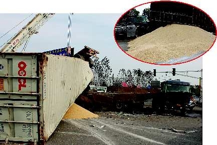 25日5时许,崇文大道兖州兴隆路口处发生—起车祸。—辆拉载20吨黄豆的集装箱拖挂车,与—辆满载盘型钢的大货车相撞,黄豆撒了—地,两车严重受损,两位驾驶员受轻伤。