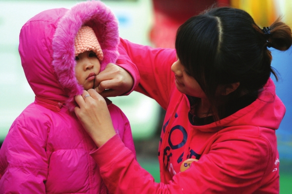 25日,受入秋以来最强冷空气影响,潍坊地区气温骤降,气温最高降幅达到10℃。图为一位老师为学生裹紧衣服。本报记者孙国祥 摄影报道