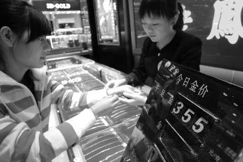 25日’在潍坊市中百大厦黄金销售专柜前’市民正在挑选黄金首饰。销售人员介绍’最近—周的时间内’黄金价格接连下调’由最高的378元每克调整为355元每克’是近年来下降速度最快的。