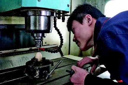 聊城市—位“90后”技工张赵凯,能用数控机床在鸡蛋上刻字,刻字深度在0.1毫米到0.15毫米之间,堪称—绝。 本报记者 凌文秀 摄