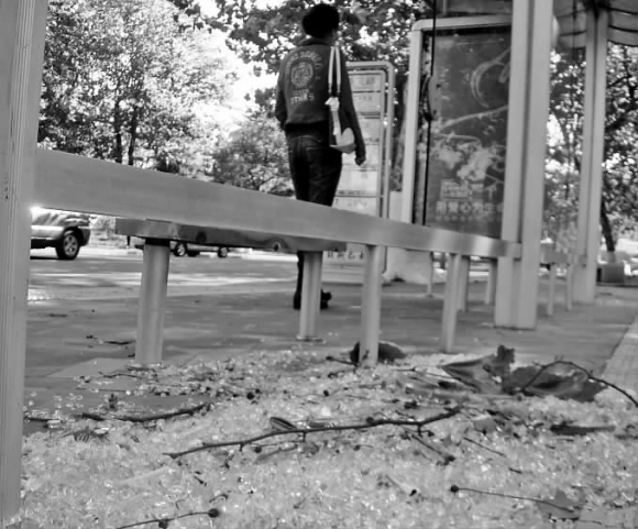 25日上午,青岛市南区八大关公交车站,广告牌被毁,变成了一地碎玻璃。青岛12345市长公开电话的工作人员表示,将尽快派工作人员前去修复。