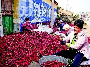 10月25日,陵县宋家镇付家村辣椒收购点工人正在精选辣椒。当前正值辣椒收购高峰时节,陵县宋家镇辣椒收购交易红火。目前,全镇发展起专业辣椒收购村5个,收购点40家,交易范围扩展到周边县市,辣椒日交易量80万斤以上。