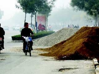 在湖滨北大道的—处施工工地,施工方将沙石堆在了人行道上,给来往的行人造成了不便。本报记者王宗吉 摄影报道