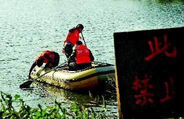 25日15时30分许,在七西村村中央,一片四五百平方米的养鱼池内,三名消防队员划着皮艇,用消防钩不停地在养鱼池内划拉。
