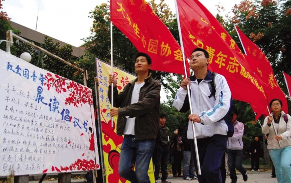 “青年,起来!早起来,读书去!”25日早晨7点整,山东农业大学18个社团的负责人高喊着口号,举着各式团旗在校园里走过。18个社团的100余名积极分子,手中拿着英语书、专业书,在校园里迎着晨光大声诵读。