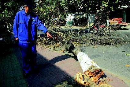 本报10月25日热线消息(记者 善文 周磊 徐升)因为根部腐烂,再加上大风劲吹,一棵直径30多厘米的行道树随时有可能被吹倒,砸伤路人。环卫工刘振红发现情况后,从早上8点多守到10点26分,提醒市民注意避让。
